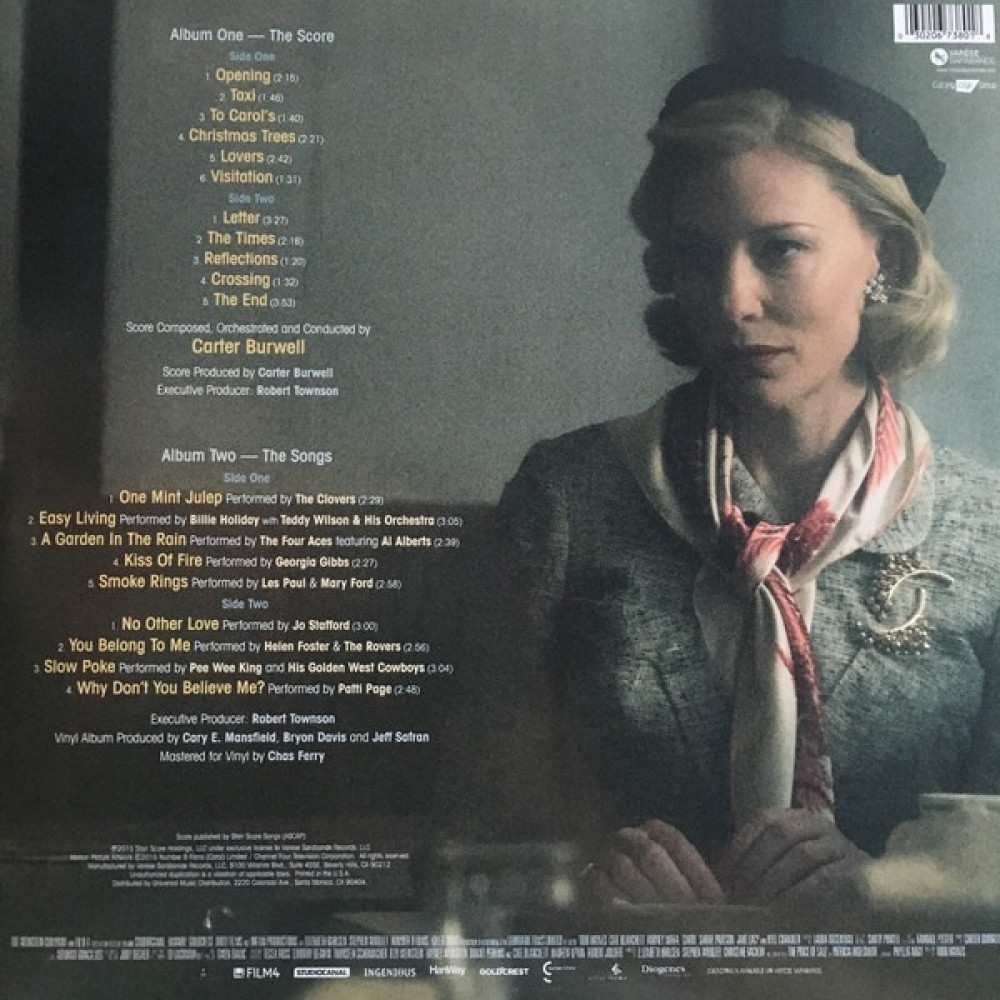 Carol: Original Motion Picture Soundtrack is the soundtrack to the 2015 film of the same name. The soundtrack of double album vinyl includes the original score, composed, produced, orchestrated and conducted by Carter Burwell, and additional music performed by The Clovers, Billie Holiday, Georgia Gibbs, Les Paul and Mary Ford, and Jo Stafford. It was released on June 24, 2016.
