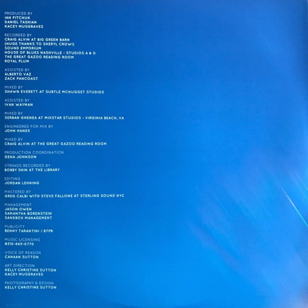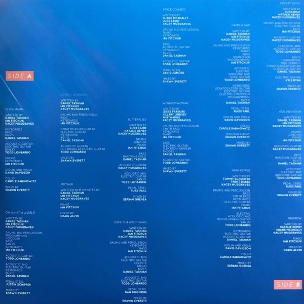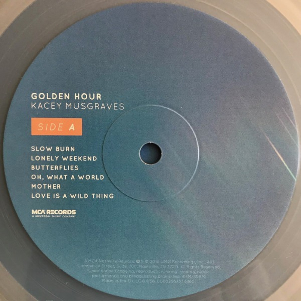 Vinyl LP pressing. 2018 release, the fourth album from country music singer/songwriter Kacey Musgraves. Kacey describes this album as having a "trippy" twist, citing the Bee Gees, Sade, and Neil Young as influences. In addition to reuniting with previous collaborators such as Luke Laird, Shane McAnally, and Natalie Hemby, Musgraves sought out pals Ian Fitchuk and the Silver Seas' Daniel Tashian as her primary co-producers and co-writers. Musgraves wrote and recorded most of the songs from the album throughout 2017; about the writing process she said: "I have a lot more love songs this time around, and I've never been one to write a love song and really feel it,". She continued: "That probably sounds like the most depressing thing ever. [But] I'm coming off getting married and being in this golden hour of my personal life, where all these things are finally coming to fruition. I found myself inspired to write about this person and all these things he brought out in me that weren't there before".